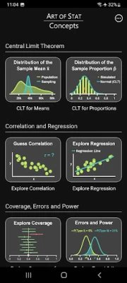Explore the Central Limit Theorem, learn about the correlation coefficient and linear regression, and visualize the coverage probability of confidence intervals or Type I & II Errors in hypothesis testing.
