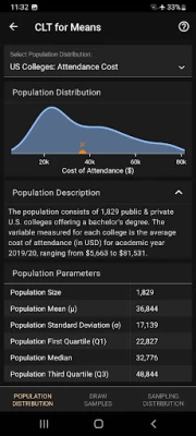CLT: Select from several real population distributions (left and right-skewed or fairly symmetric) and simulate taking a sample from the population.