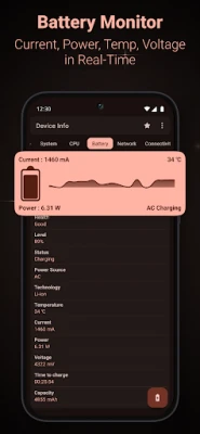 🔋 Battery: Monitor your battery's health, level, status, power source, technology, temperature, voltage, power (watts), current (mA), and capacity in real time.