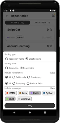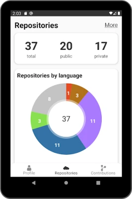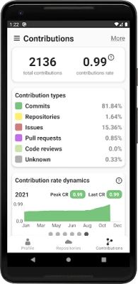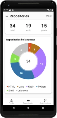 Major features: - Github profile summary - Plot with your repositories languages - Your repositories list with filters - Contributions summary - Contributions plots (contributions per day, contribution rate)- - Contributions grid (GitHub-like)