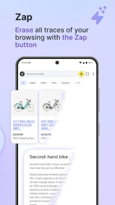 The Qwant app also includes an innovative feature for discreet web navigation: the Zap button! With Zap, you can delete all your browsing data in a single click. No need to dig through settings or hunt down trackers and cookies one by one. Use it as much as you want before or after every session on Qwant.